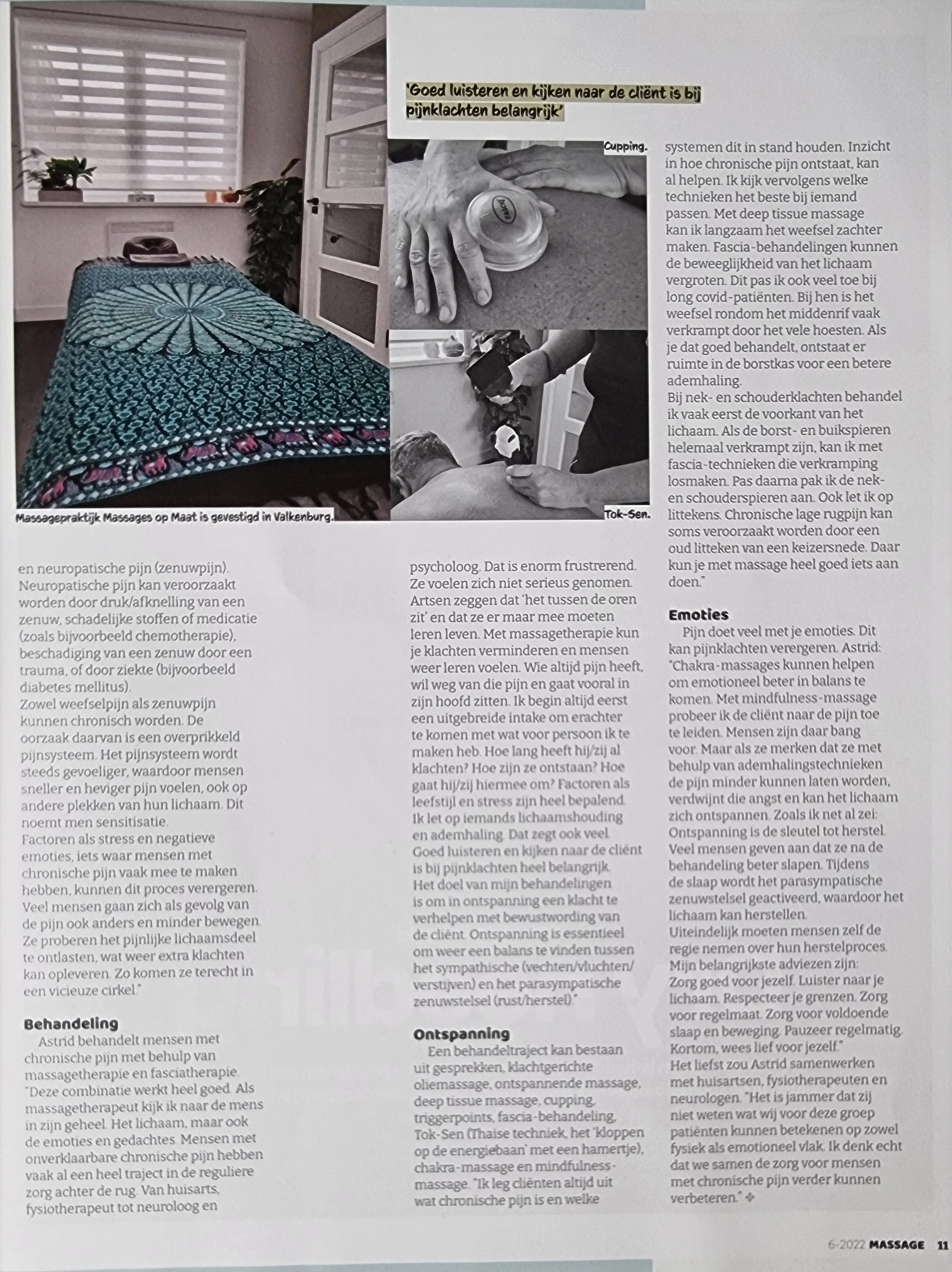 “Of je nu een klacht hebt of gewoon voor de ontspanning gaat, een massage is een cadeautje aan jezelf.”